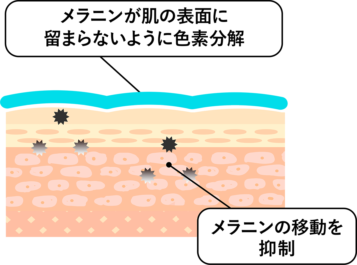 ナイアシンアミドは、肌の中に隠れているメラニンが肌の外に出ないようにメラニン色素の移動を抑制し、すでに生成されたメラニン色素は皮膚表面に溜まらないようにメラニン色素分解する効果のある成分です。